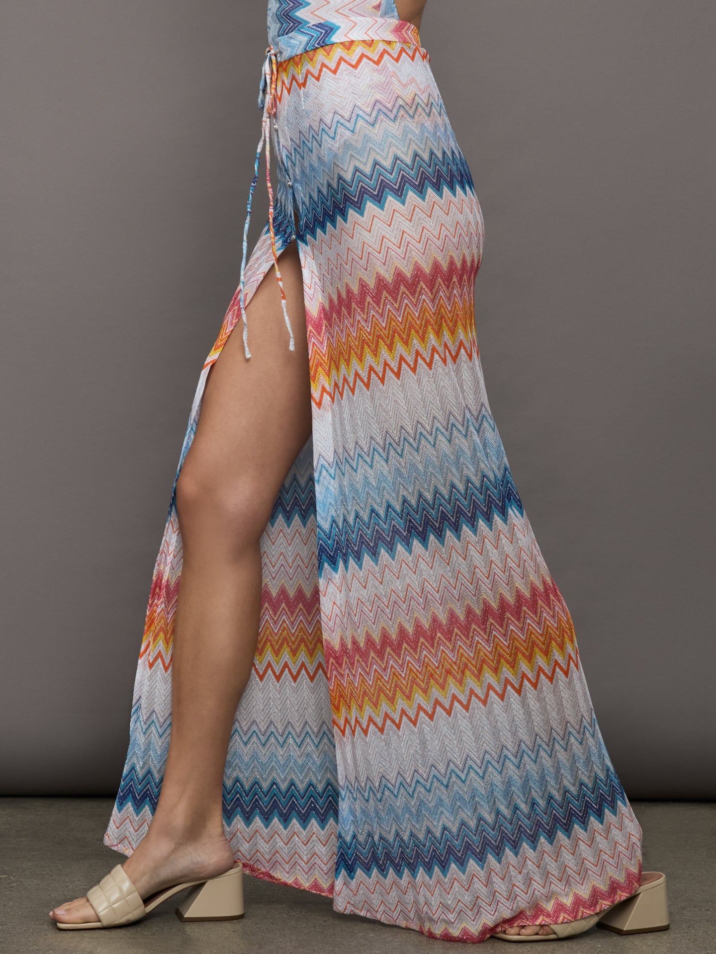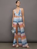 Crafted from a viscose blend with luminous reflections of lamé, this women’s long skirt with Missoni’s iconic zigzag motif expresses all the eclecticism of the maison. The model is completed by a practical drawstring at the waist, which allows you to adjust the fit with elegance. The light and sparkling fabric, animated by the dynamic lines of the decorative motif, gives the garment a refined movement and a sophisticated shine.
