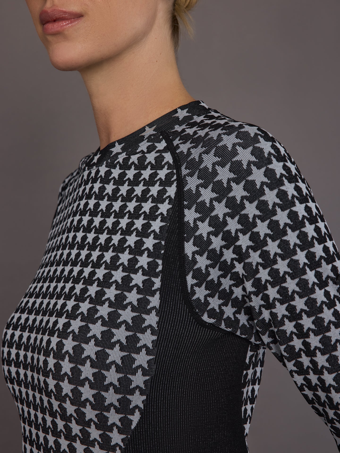 For skiers and cold-weather athletes who want a sleek, flexible first layer. This seamless baselayer top offers smooth stretch with moisture management and quick-dry performance. The contour paneling supports movement and creates a streamlined silhouette. The all-over star pattern adds bold style under jackets or worn solo at the lodge.